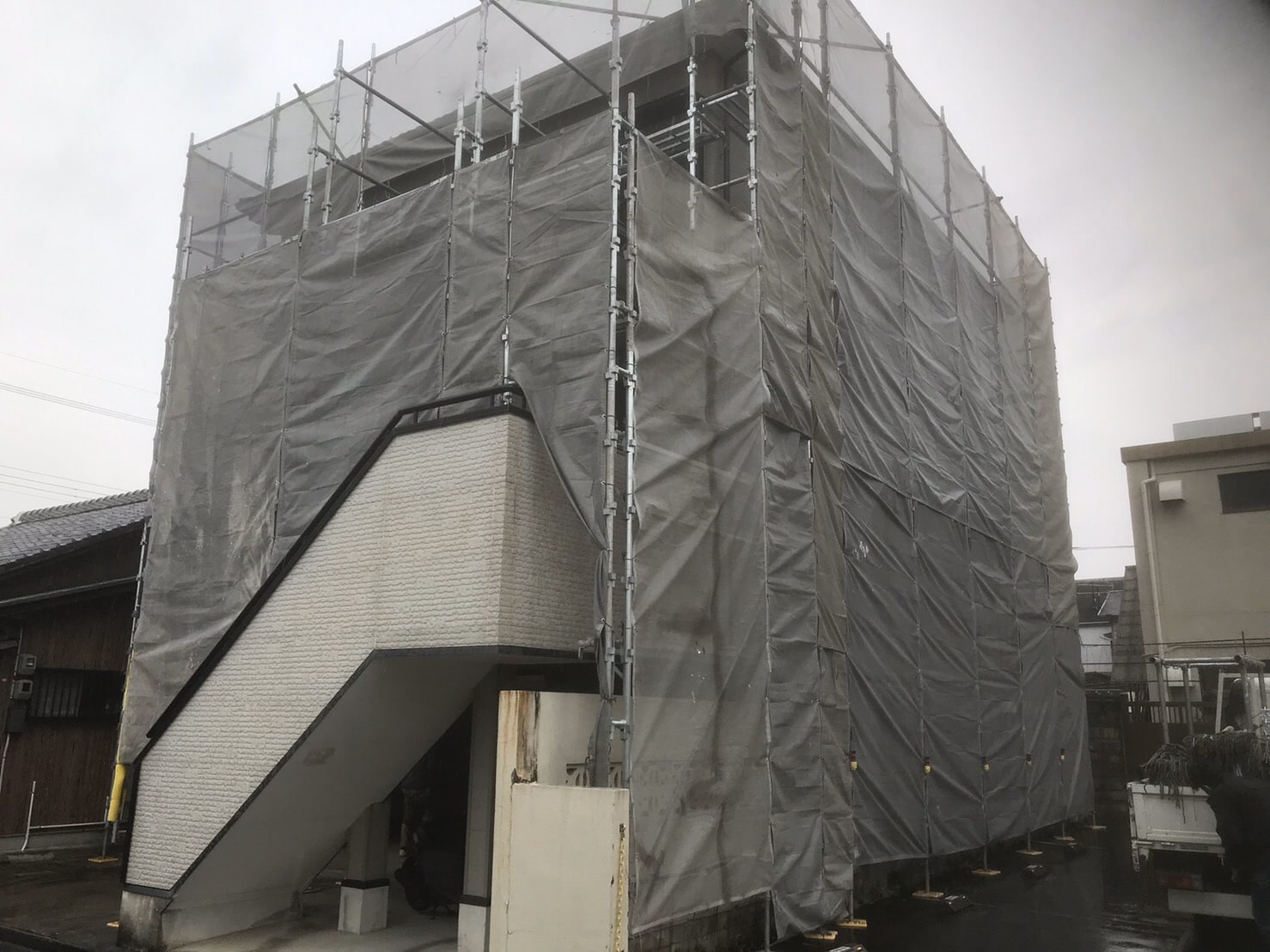 三重県松阪市にあるマンションの塗装用塗り替え足場の組立・解体を行いました。